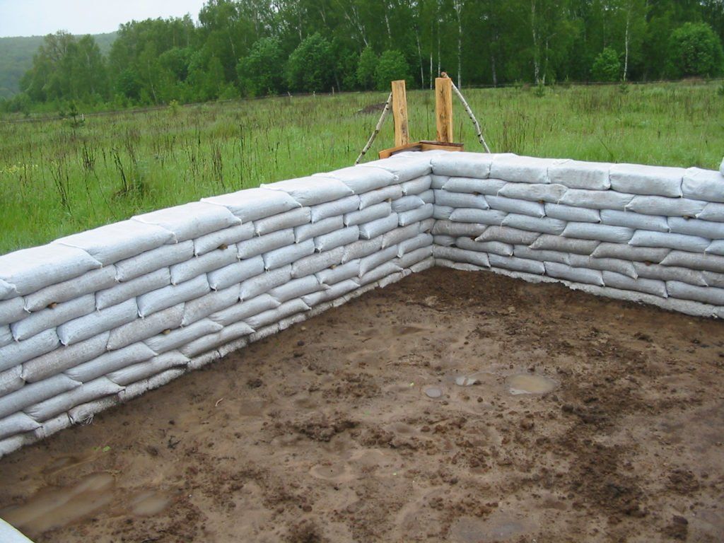 Този вариант е идеален за тези, които имат много излишна почва, останала след завършване на строителството или например изкопаване на езерце. Всичко, от което се нуждаете, са полипропиленови чували с дебелина 50 кг. Напълнени с влажна почва, те ще служат като тухли за стените. Броят на чували, от които се нуждаете, зависи от височината и площта на конструкцията, която ще се строи.