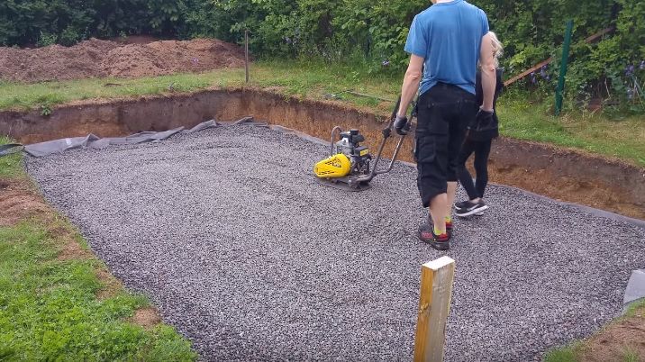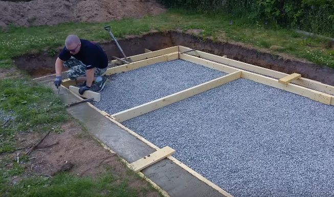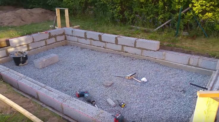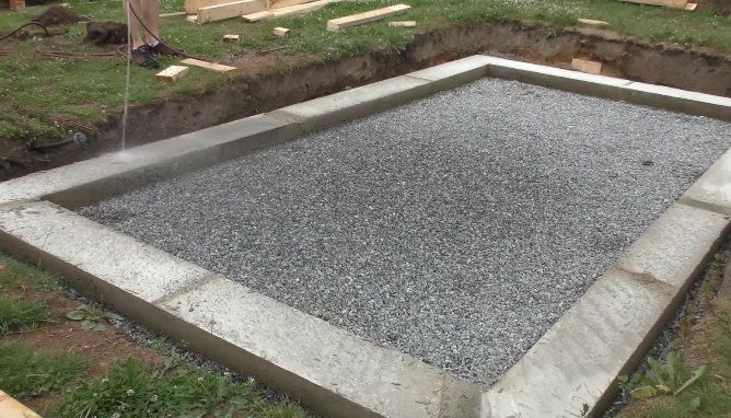 Фундаментната рамка е маркирана. Изкопава се изкоп и се запълва със смес от пясък и чакъл.