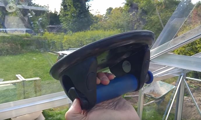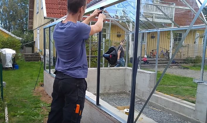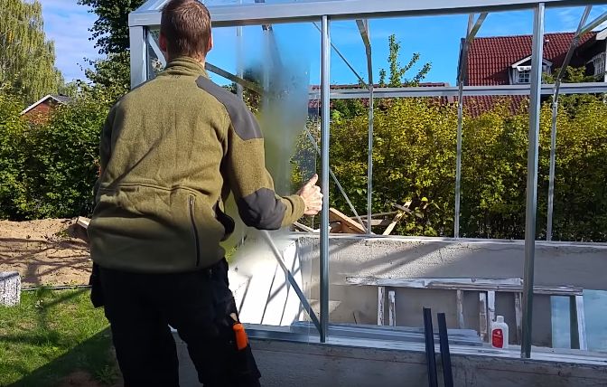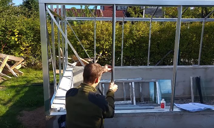 Оранжерията е остъклена. Може да се използва шпакловка или силиконов уплътнител, за да се предотврати проникването на влага в стъклото. При необходимост при монтаж на стъклото могат да се използват вендузи.