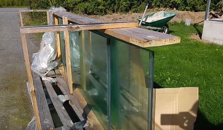 Остъкляването започва от стените. Дървени летви или стъклопакети с размери 2 x 4 или 2 x 2 см се изрязват предварително и се закрепват с пирони.