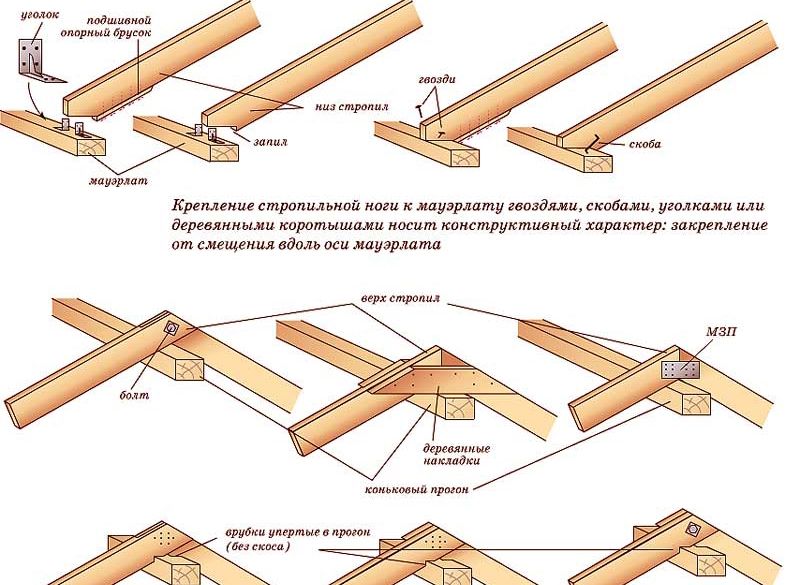 Гредата на билото се монтира и закрепва към стълбовете, след което гредите се закрепват към фронтоните. Препоръчително е да се използват скоби или пирони като крепежни елементи.