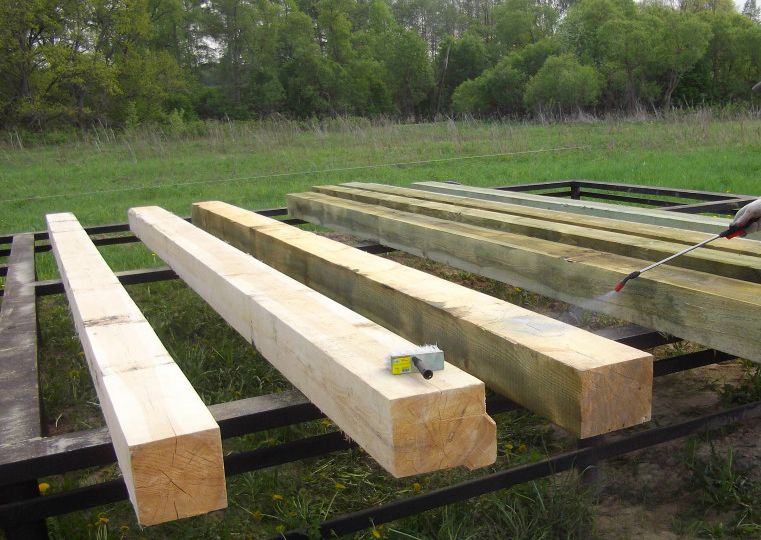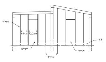 - Долната рамка е изработена от дървени греди с размери 10x10 см или тръба с размери 5x5 см. За подобряване на износоустойчивостта дървените елементи се обработват с антисептик и се боядисват с керосиново-битумен мастик, а металните секции са покрити с антикорозионни съединения.
