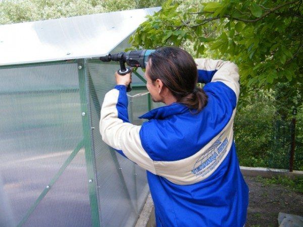 При избора на клетъчен поликарбонат като покривен материал, оранжерията се покрива отвън, като се използват самонарезни винтове за закрепване.