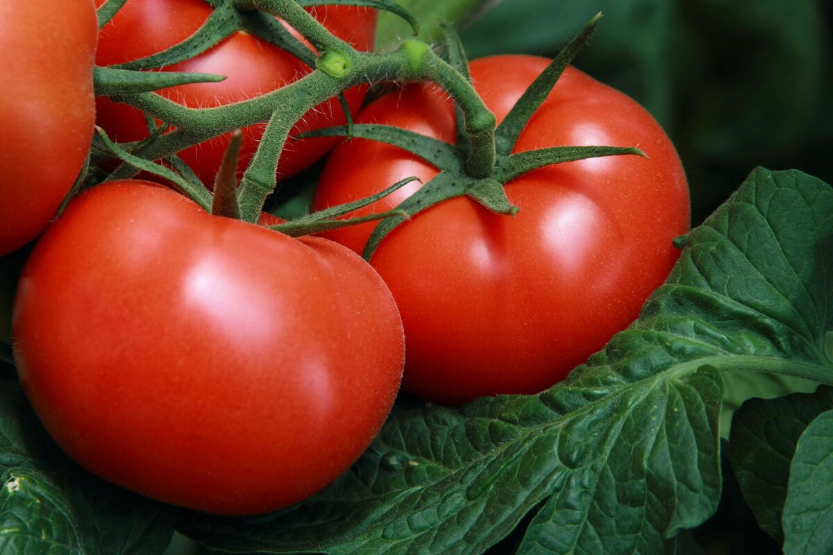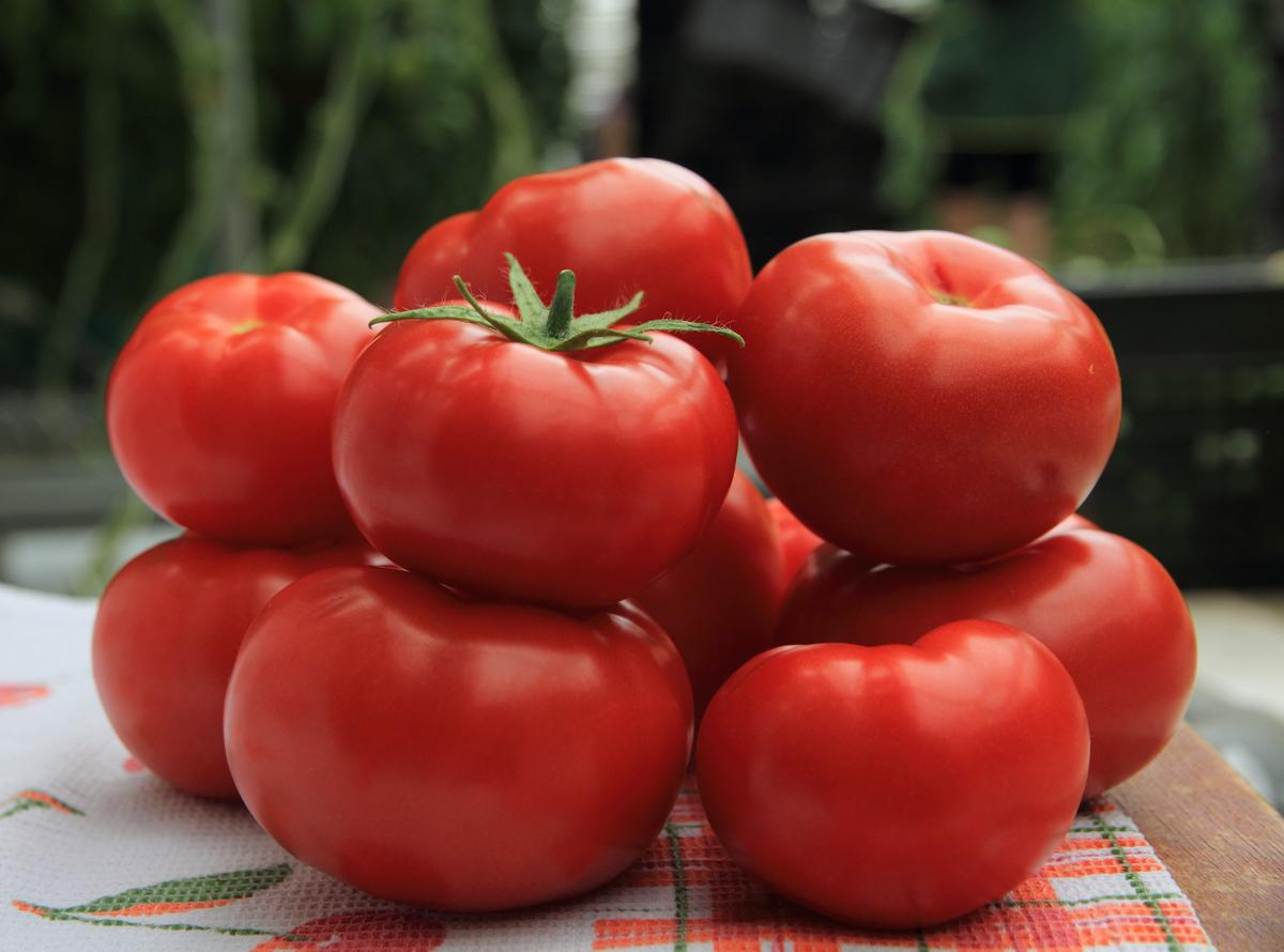 Тя има много големи, яркочервени домати, които са узрели.