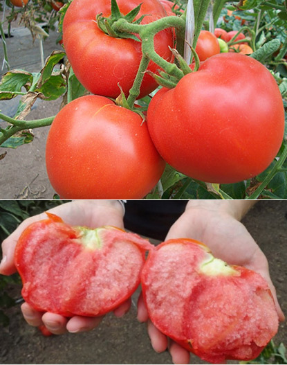 Къснозреещ детерминантен сорт за открита земя и оранжерии. Изисква подравняване и формоване. Подходящ за салати и преработка в доматени продукти. | Плоско-кръгли, леко оребрени, със средна плътност и розов цвят, 200-500 г. Добър вкус. |