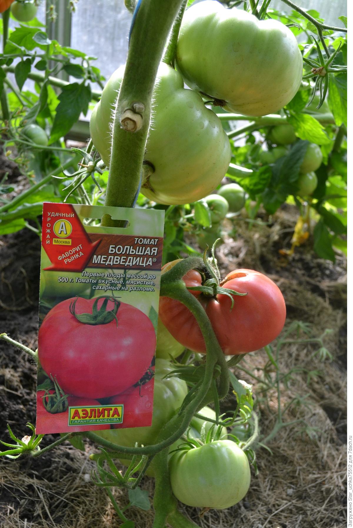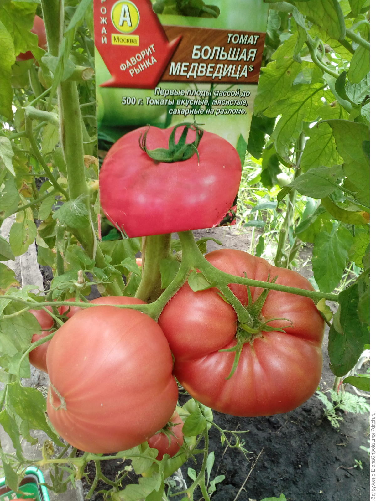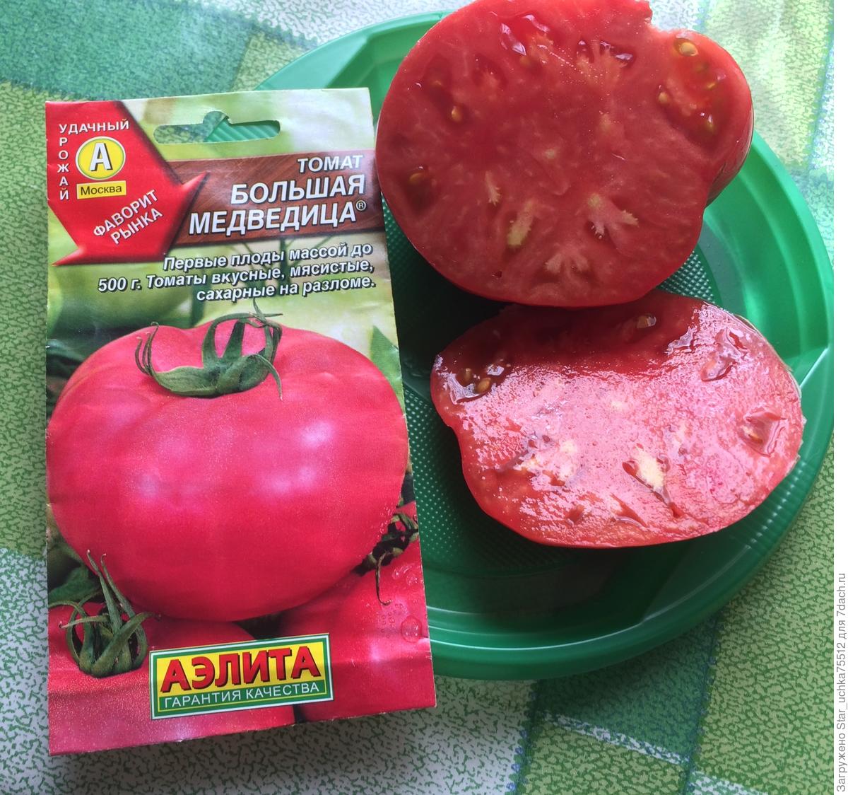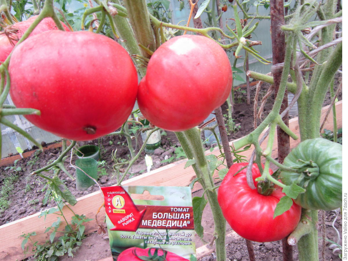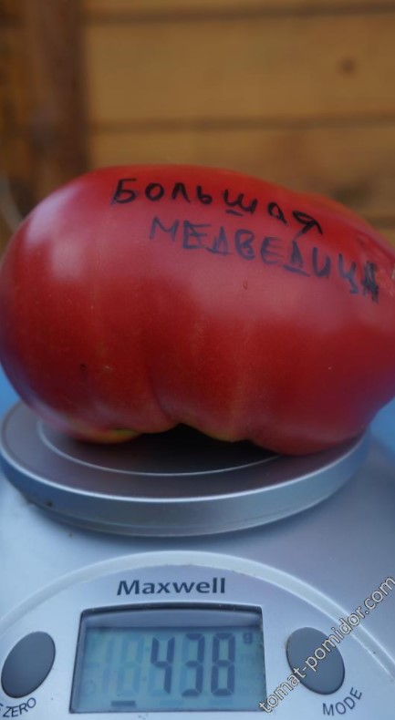Доматът „Голямата мечка“ превъзхожда много други по своите характеристики. Един домат „Голяма мечка“ е достатъчен за приготвяне на храна за цялото семейство. Плодовете му тежат до 500-800 г.
