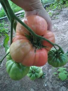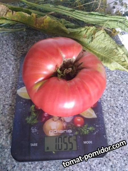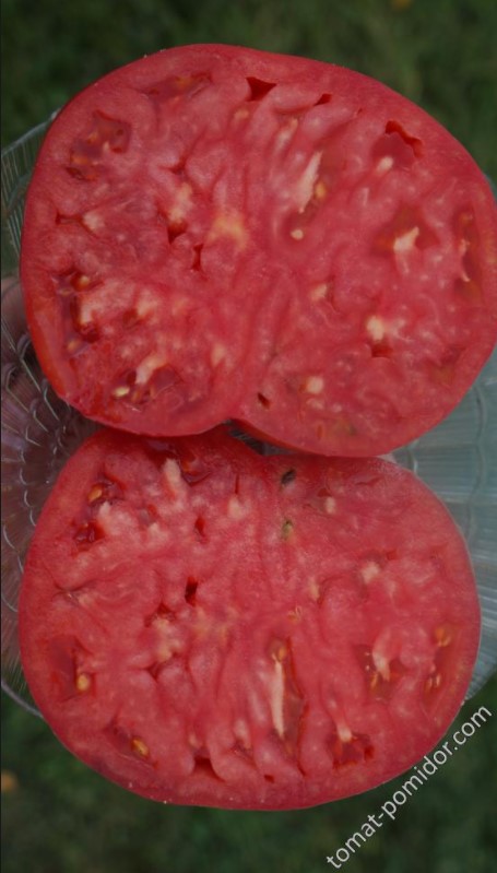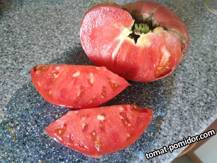 Един от ранните сортове с най-големи плодове — първите домати тежат цял килограм. Подходящи за консумация в прясно състояние. Салата от един плод може да нахрани цяло семейство. Този индетерминантен сорт расте 150-200 см височина. Първото съцветие се появява над 6-9-ти лист, като следващите съцветия се появяват на разстояние 1-2 листа едно от друго. Приблизително 100-110 дни след поникването растенията започват да узряват вкусни домати — кръгли, плоски, с лъскава розова кора и розова, зърнеста, захарна плът. Плодовете са едри, с тегло 210-260 грама (до 500 г), с повече от 6 камери, плътни и месести. Добивите са високи, 12-15 кг/м3. Сеитба. Отглежда се от разсад, със задължително бране на етап 1-2 истински листа. Разсадът се засажда на 60-65-дневна възраст, с разстояние 3-4 на 1 м. Растенията се връзват и се формират на 1-2 стъбла. Премахването на страничните издънки (доведените деца) е задължително.Неопределено. Беше високо над 2 метра в оранжерията. Имаше два ствола.