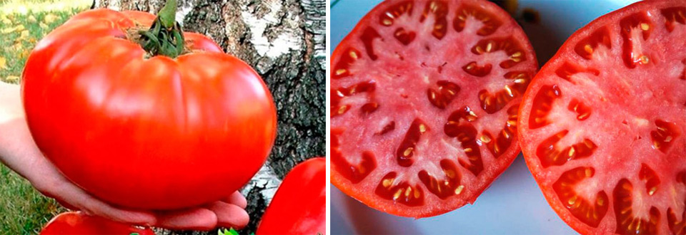 Този сорт се характеризира с гигантски плодове, които могат да тежат до 2 кг. Доматите имат червена кора и червена плът. Формата е кръгла и сплескана в основата, въпреки че някои плодове са неправилни. Няма зелено петно близо до стъблото; има леко оребряване.