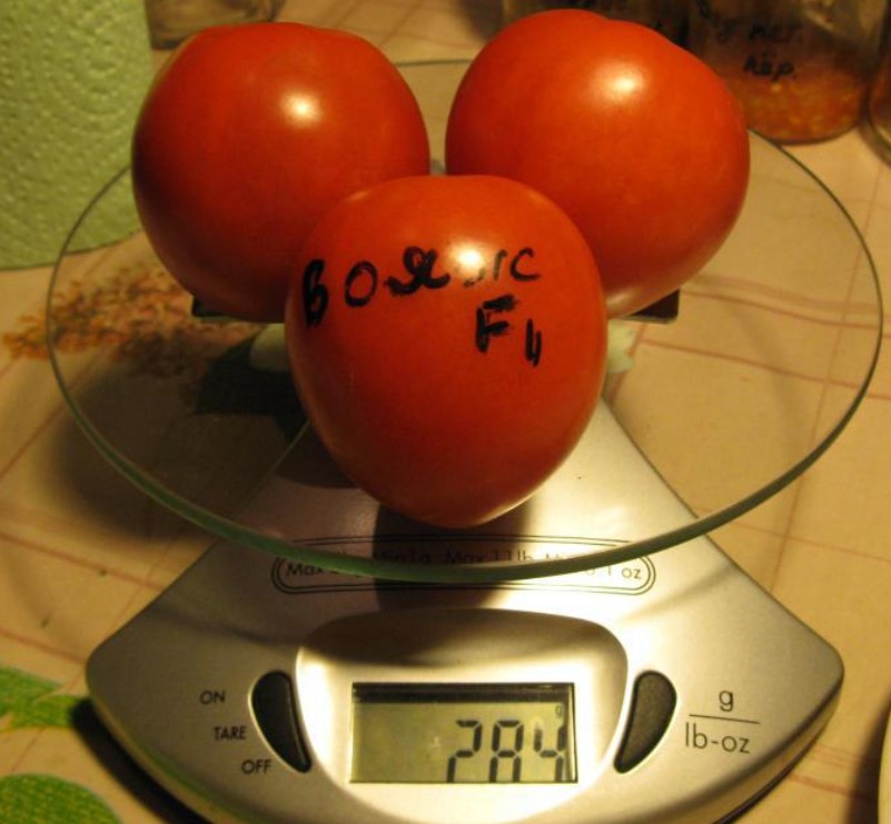 Среднозреещ индетерминантен сорт за открита земя. Изисква подравняване и формоване. Подходящ за салати и преработка в доматени продукти. Продаваемост: 56% (Новосибирска област). Понася суров климат. | Сърцевидни, кръгли, с леко заострен връх, червени, 500-700 г. Отличен вкус. |