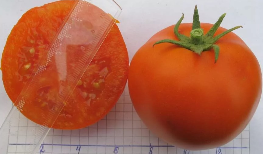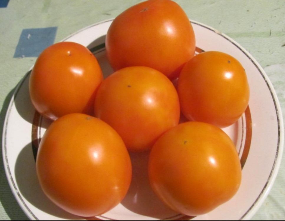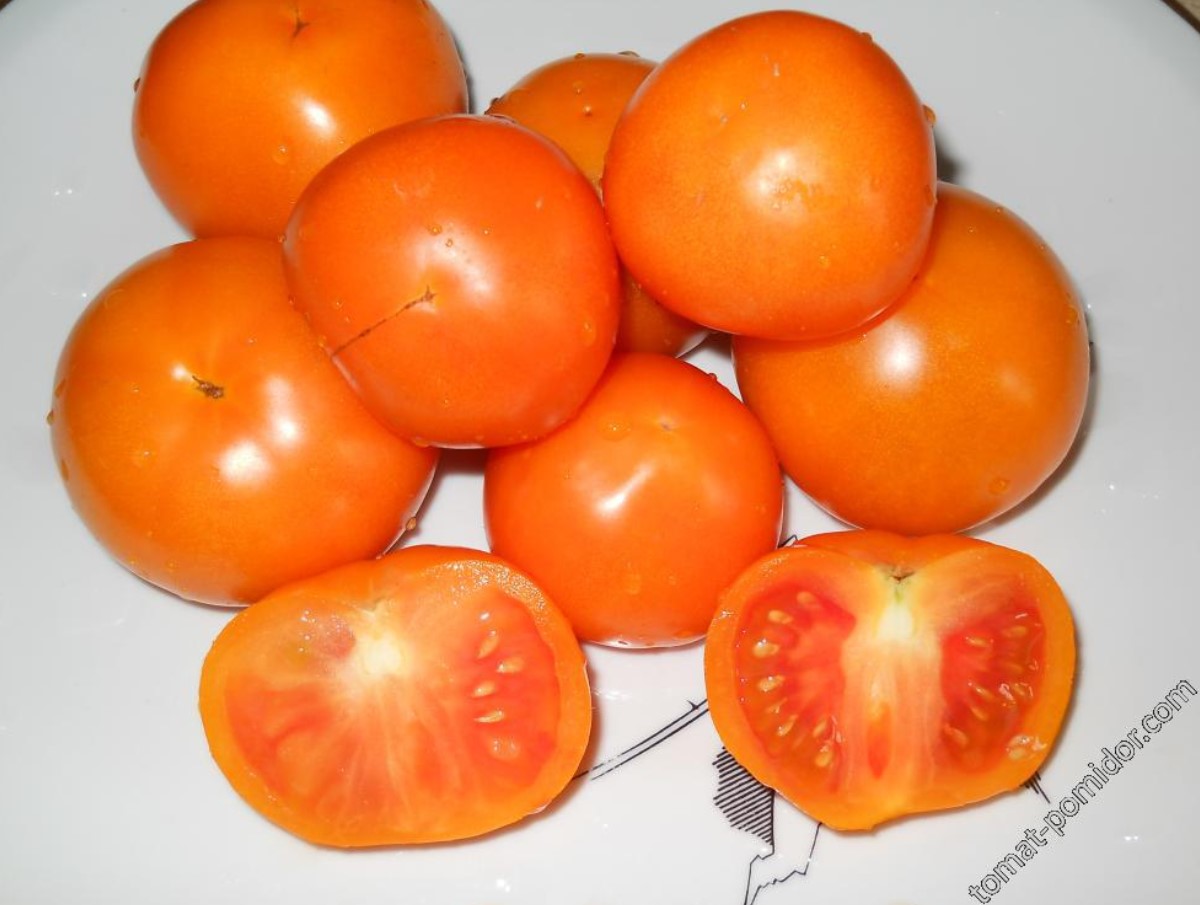 Среднозреещ индетерминантен сорт за открита земя и оранжерии. Изисква подравняване и оформяне. Подходящ за салати. Продаваемостта е 98%, а добивът на зрели продаваеми плодове е 74% (Новосибирска област). Устойчив на неблагоприятни условия на отглеждане, устойчив на топлина и лесен за транспортиране. | Кръгли, гладки, оранжеви, 160-218 г. Отличен вкус. Плодовете се съхраняват добре. |