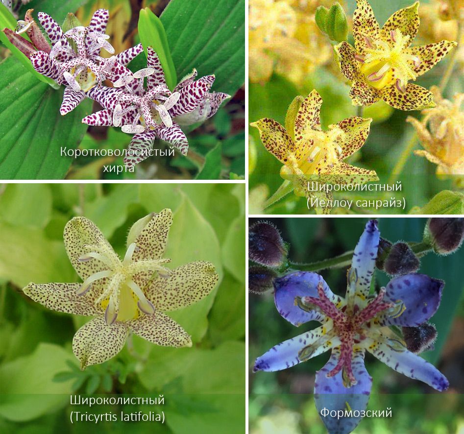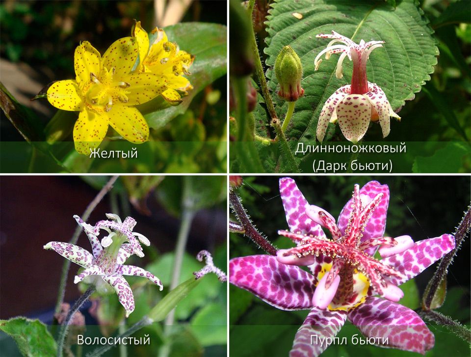 | Формосан (красив, тайвански) (Tricyrtis formosana) | Цветовете варират в голямо разнообразие - бели, лилави, розови с бордо или кафяви петънца. Стъблата с височина до 80 см са окосмени, с овални листа. Един от най-лесните за отглеждане сортове. |
