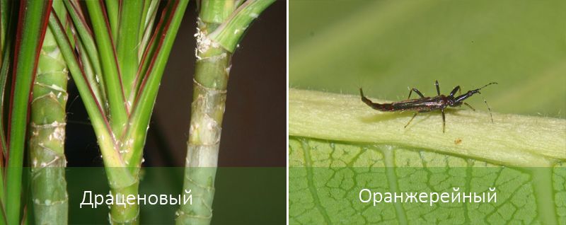 | Драцена | Достига до 0,1 см дължина, тялото е черно-бяло, а ларвите са прозрачни. | Любимо място - листа. |