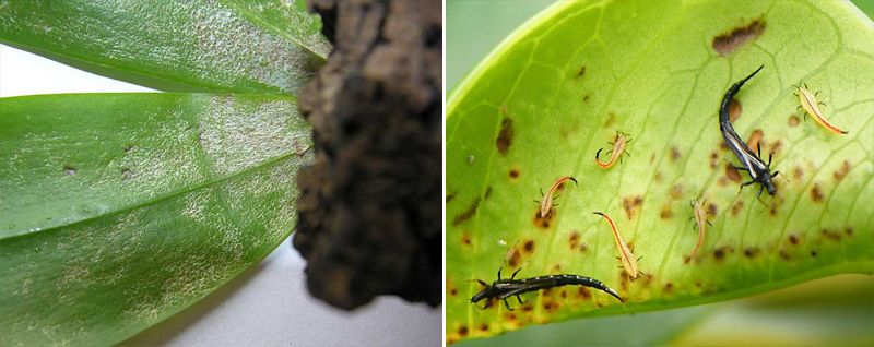 | Оранжерия (черна) | Този вредител е насекомо от рода на трипсите със стандартен размер (около 0,1 см). Има по-тъмно оцветяване отпред, а също така има лек контраст между тялото и крилата, антените и краката, които са малко по-светли на цвят от тези на другите видове. | Орхидеите предпочитат да бъдат поставени на частична сянка и с почва, която практически никога не изсъхва. |