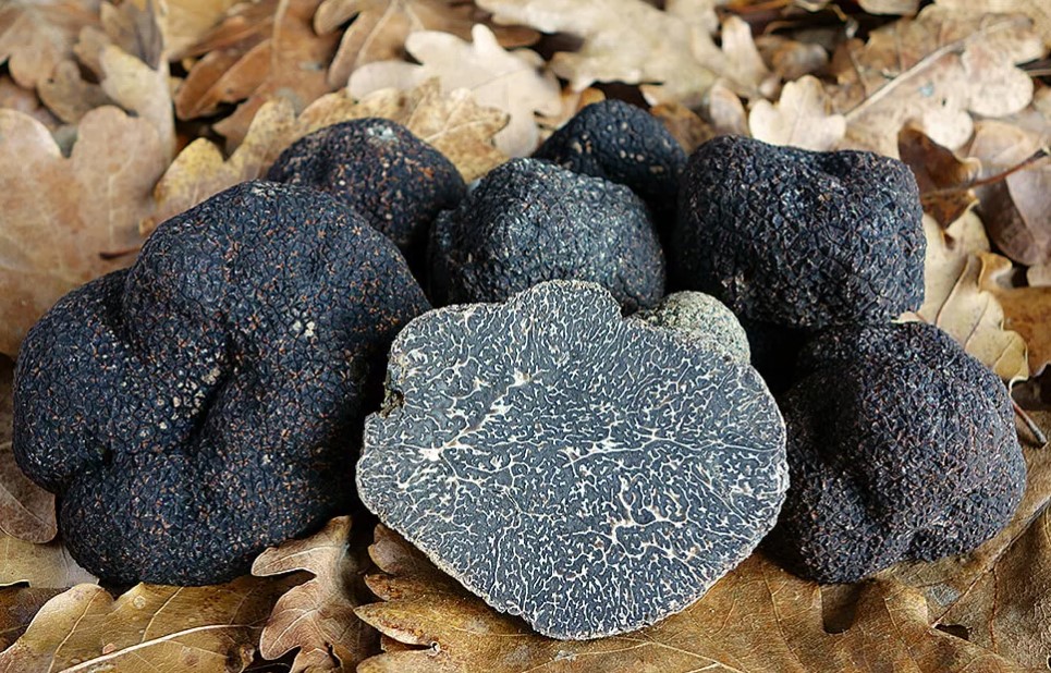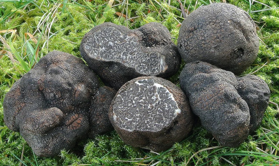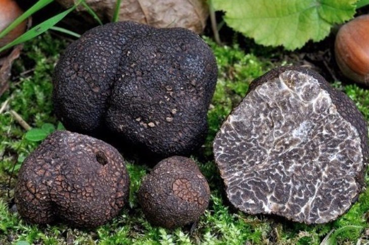 | Перигорски трюфел, черен трюфел, френски трюфел (Tuber melanosporum) | Плодното тяло е с диаметър от 3 до 9 см, с цвят от червеникаво-кафяв до черен. Повърхността му е с 4-6 фасети, а кората е неравна. | Един от най-скъпите видове трюфели. | Ноември-март. | Франция, централна Италия, Испания. Образува микориза предимно с дъб и се култивира изкуствено в други страни, особено в Китай. |