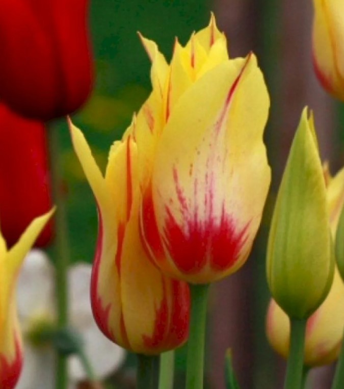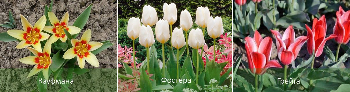 | Просто | Те растат до 35-45 см. Отглеждат се на открито или в контейнери. Не са предназначени за рязане. | Бокаловидна, канарчевожълта или аленочервена. Краят на април. |
