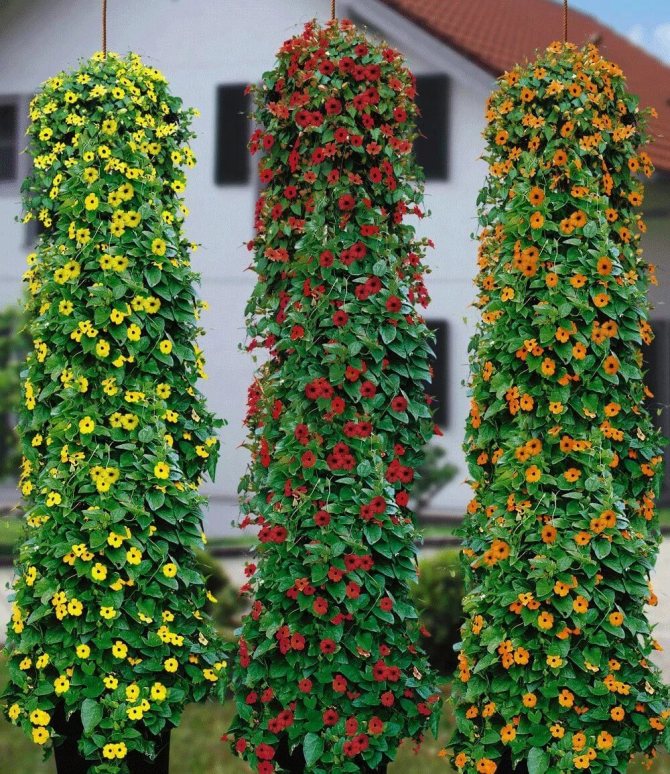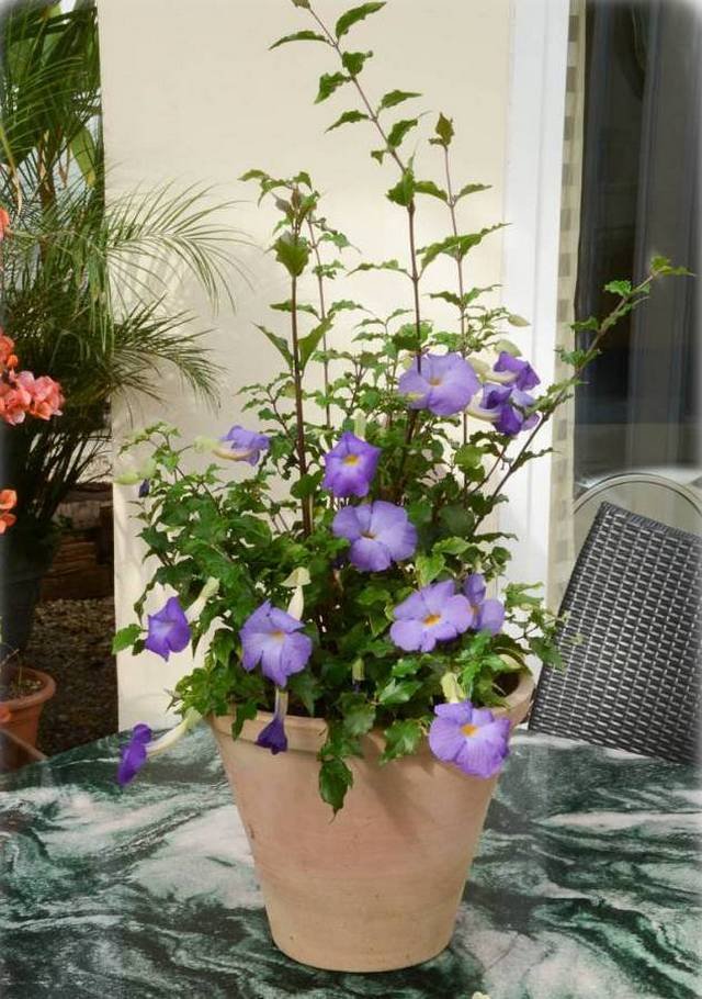 Моля, обърнете внимание! Много разновидности на крилата тунбергия се отглеждат не само на открито, но и на закрито в саксии или висящи кошници. Това растение е отличен избор за озеленяване на балкон или лоджия.