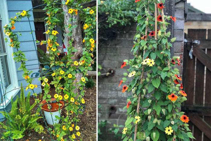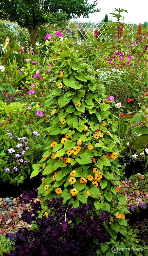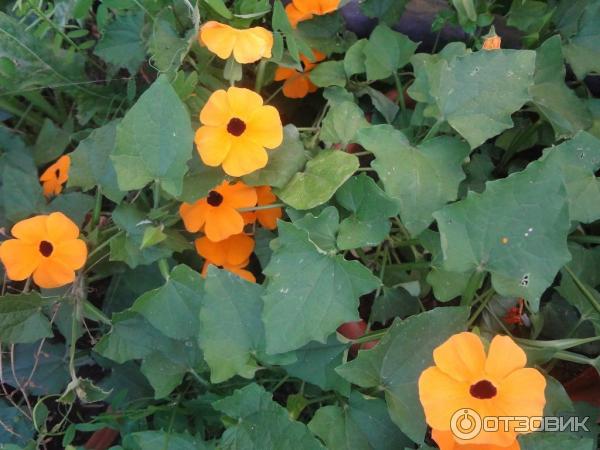 Между другото, в Европа тунбергията се нарича „Черноока Сюзън“. Въпреки че, ако се вгледате внимателно, окото на цветето е тъмнолилаво.