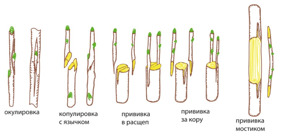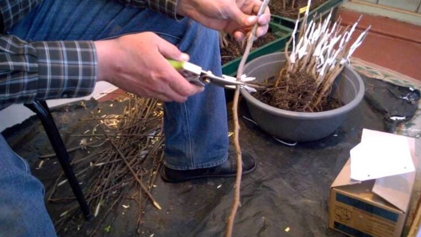 Изберете подложка и издънка от сорт с 3-4 пъпки. През есента поставете отрязания край на издънката в контейнер, пълен с влажен пясък. Съхранявайте го в хладилник за зимата при температура от 2 до 4°C. Няколко дни преди засаждането прехвърлете издънката върху влажна кърпа. Най-добре е това да се направи през май, а пъпкуването е най-добре в началото на юни.