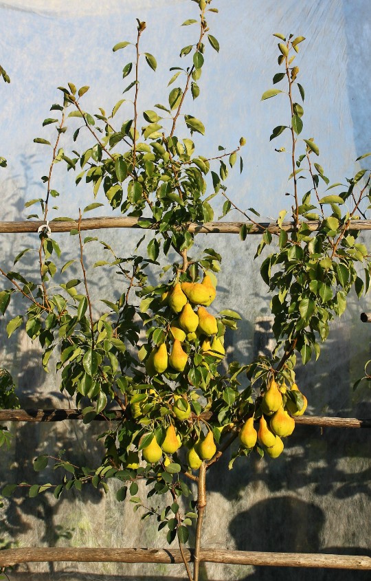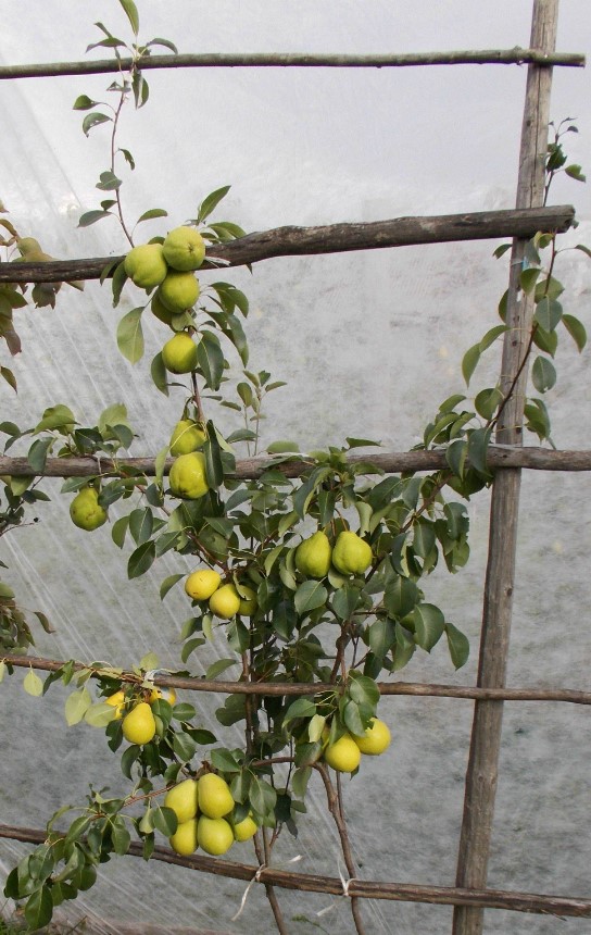 Не съм измислил нищо ново; използвах само познати елементи, подходящи за моите условия и моя мързел. Предпочитам присаждане върху арония. Плодовете са малко по-едри и е по-лесно да се контролират излишните издънки. При аронията същият сорт узрява 3-5 дни по-рано. Не мисля, че присаждането на круша върху растящ храст е най-добрият вариант. Дори присадката да е направена по периферията и дори да е от южната страна, тя ще получава по-малко хранене и светлина поради зрелите съседи. Затова отглеждам крушата на пергола. Засадих първите храсти на 1,5 метра един от друг, сега го правя на един метър. Поставям най-много една или две присадки на храст. За зимата навеждам всички присадки към земята.