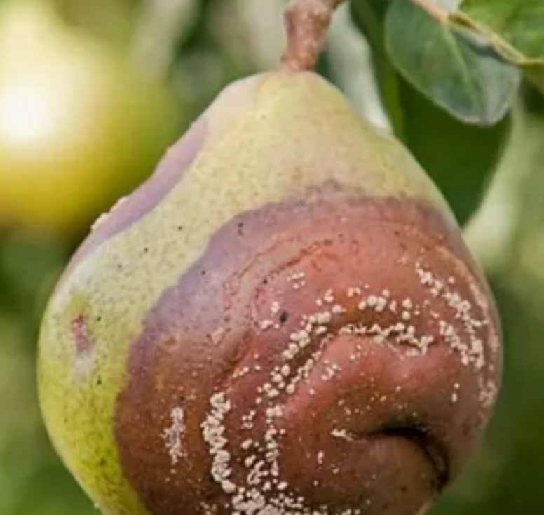По плода се появяват кафяви петна, които след това покриват цялата повърхност. Плодът не пада, което позволява на инфекцията да се разпространи бързо. | Съберете и изгорете всички засегнати плодове (както от клоните, така и от земята). Това ще предотврати разпространението на болестта. | Пръскане с бордолезова смес или меден хлорид. |