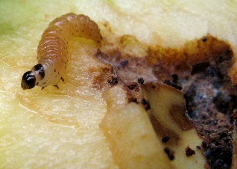 Това е пеперуда, която снася яйца по растенията. От тези яйца се излюпват гъсеници, които се хранят с пулпата на плода. | Третиране с Агравертин преди и след цъфтежа. | Третирайте с Агравертин, напръскайте с Кинмикс 20 дни след цъфтежа и след това напръскайте с Искра седмица по-късно. Ако гъсеници са се заселили в стъблата, ще е необходимо повторно третиране след прибиране на реколтата. През есента съберете и изгорете всички листа и прекопайте почвата до дълбочината на лопата. |