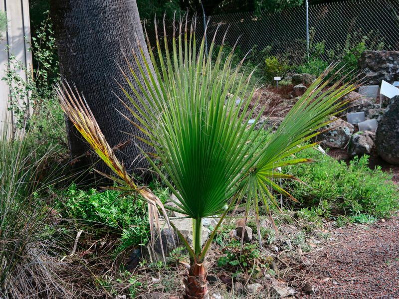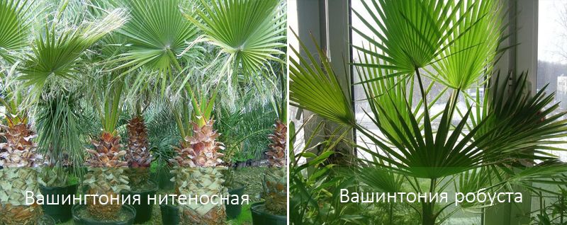 - Вашингтония робуста. Дървесно многогодишно растение, което расте до 30 м в дивата природа. На закрито достига 50 см височина през първата си година, но продължава да расте, понякога достигайки 3 м. Тънкият му, удължен ствол има леки надлъжни пукнатини. Листата са ветрилообразни и разделени на трети. Дръжките са удължени, червеникави в основата. Цветовете са светлорозови. Понася лошо топлината, така че при температури над 30 °C (86 °F) растението трябва незабавно да се засенчи. През зимата вирее при стайна температура (21–23 °C).