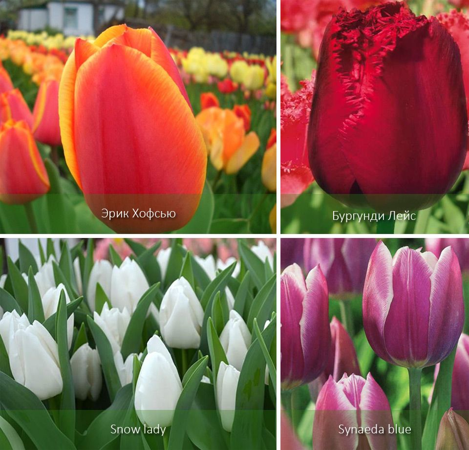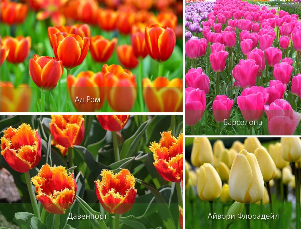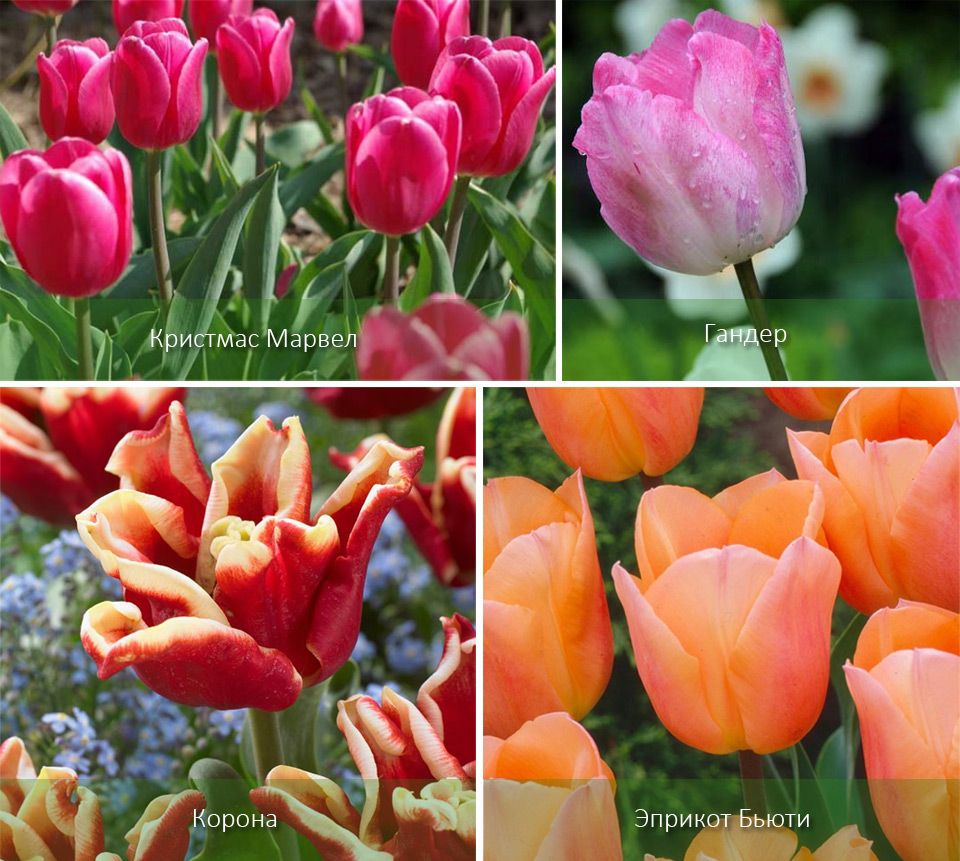 Но можете да използвате и средноцъфтящи сортове: лилиеви, папагалски (15-16 седмици). Към цъфтящите през март сортове добавете: късни махрови сортове, хибриди Дарвин (16-19 седмици). Всеки от горните сортове може да бъде събран на 1 май (до 22 седмици).