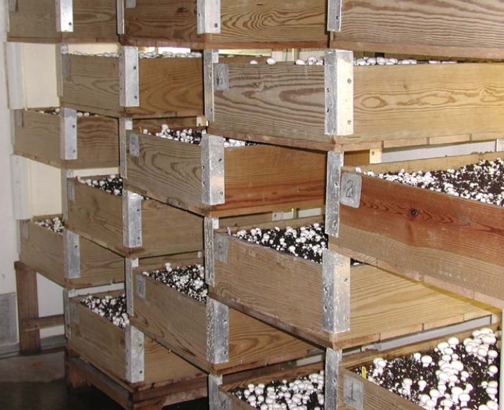 Технологията за отглеждане на мицел в кутии е абсолютно същата като тази за отглеждане в торби, с единствената разлика, че вместо полиетиленови рамки се използват дървени. Кутиите могат да се поставят не само на рафт, но и в затворен шкаф или до вентилационна тръба.