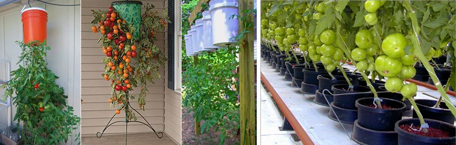 Има и други начини за отглеждане на домати в кофи. За да спестят място, някои градинари засаждат домати във висящи кошници, където разсадът расте надолу от дупка в дъното на контейнера. Този метод поддържа добър добив, вкус и други характеристики на сорта.