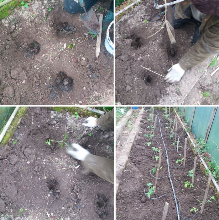 - След това, при засаждането, изкопахме дупки, доста дълбоки. Сложихме хумус, смесен с пепел, отдолу, покрихме всичко с пръст, поставихме доматите в тях и ги закрихме, като ги уплътнихме леко. След като всичко беше засадено, настроихме капково напояване.
