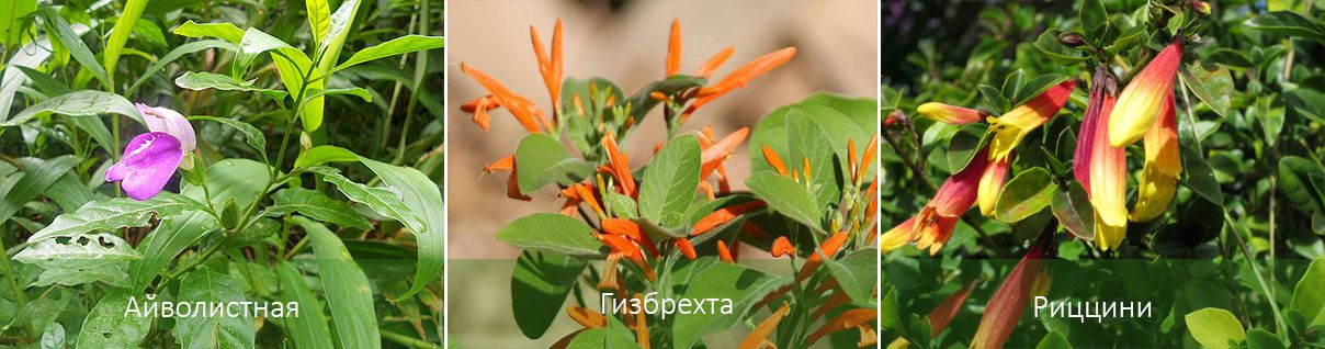 | Рицини | 40-60 см. Издънките са разклонени. | 7 см дължина, 2,5 см ширина. | 2 см. Жълто с червен оттенък. Тръбата на венчето е покрита с петна. |