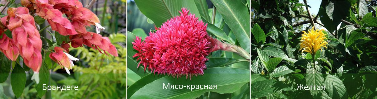 | Брандедж | Достига 80-100 см. | 7 см дължина, зелена с матов блясък, овална удължена форма. | Бели, с жълти прицветници. Цъфтят последователно, със съцветие с дължина 10 см. |