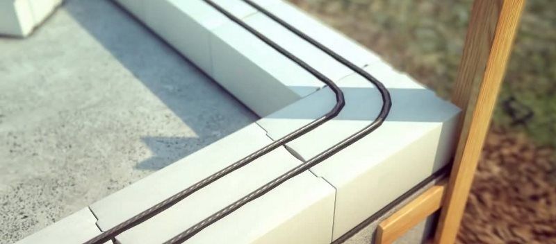 Фундаментът трябва да бъде подсилен, тъй като неспазването му може да доведе до напукване на пенобетонната зидария поради сезонни движения на земната основа. За надлъжното армиране на лентата използваме арматурно желязо клас 10-A-III (A400) (GOST 5781-82), а за напречните връзки използваме арматурно желязо клас 6-AI (A240) (GOST 5781-82). Свързваме арматурата в пресечните точки с отгрята тел. Обръщаме особено внимание на армирането на ъглите.