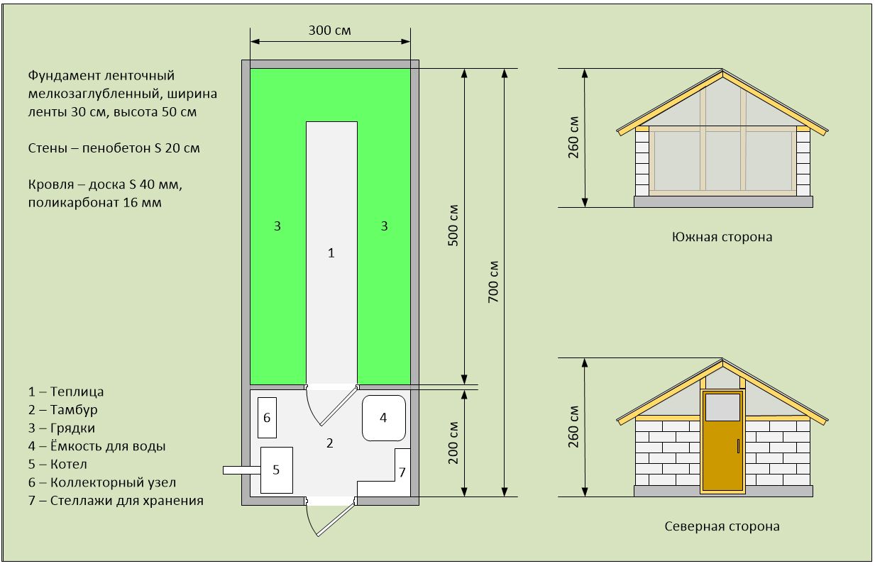 Както можете да видите от скицата по-долу, ще покрием южния край с два слоя поликарбонат. Вестибюлът, който ще бъде разположен от северната страна, ще осигурява защита от вятъра и ще служи като котелно помещение, складово помещение и рафтове. Склоновете на оранжерията ще бъдат покрити с подсилен поликарбонат. Дървена греди ще предотврати образуването на термомостове.