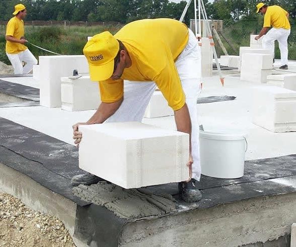 За полагане на пенобетонни блокове използваме специално лепило, което позволява минимална дебелина на фугата, като по този начин намалява топлинните загуби. Те могат да се полагат и с циментова замазка, но в този случай не забравяйте да включите допълнителна изолация и измазване на стените.