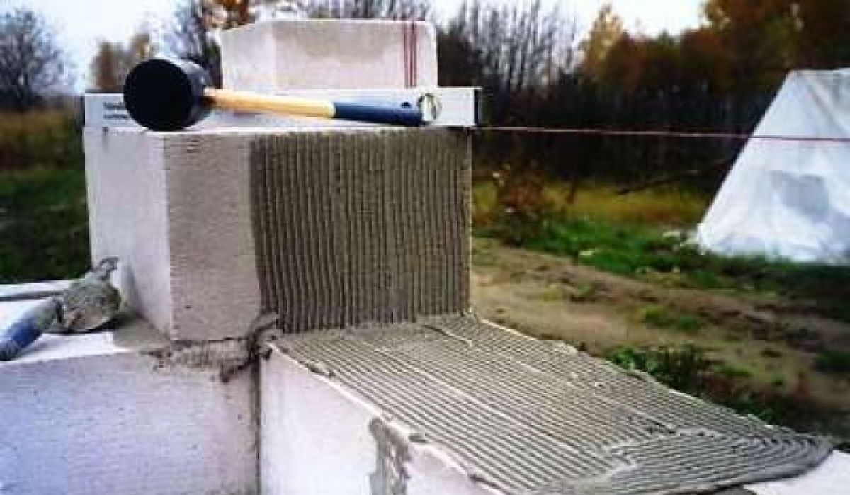 Армираме зидарията със заварена зидарска мрежа на всеки 2-3 реда. При височина на блока 30 см и изчислена височина на стената 150 см, има 5 реда зидария, така че можем да положим армировъчната мрежа между третия и четвъртия ред. Нанасяме лепило върху мрежата и след това монтираме блока отгоре. Можем също да армираме зидарията с арматурно желязо, поставено в каналите, изрязани в блоковете.
