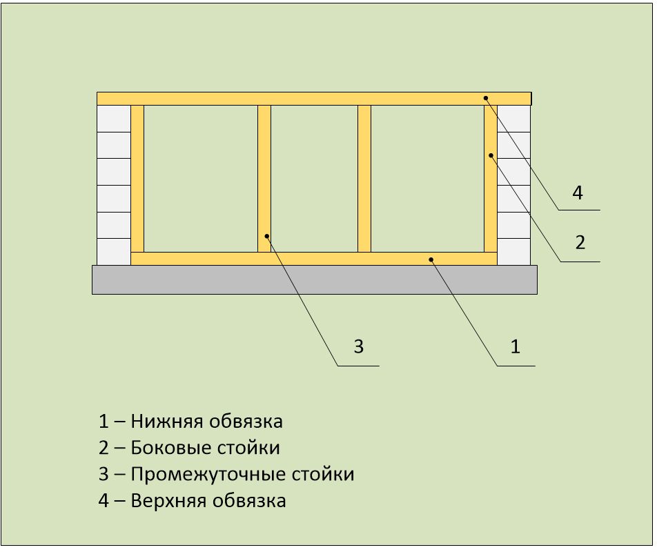 Изграждаме южната стена. Полагаме долната обшивка върху основата, върху хидроизолацията, и я закрепваме към основата с анкерни болтове. Закрепваме страничните дървени стълбове към газобетонната зидария с анкери. Закрепваме междинните стълбове и горната обшивка с ъгли и винтове.