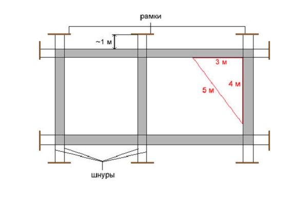 Сега можем да започнем с маркирането на основата. Ще монтираме дъски и плоскости в ъглите на бъдещата оранжерия. Ще прикрепим канап към тях и ще го опънем по периметъра на основата. Ще проверим дали ъглите са перпендикулярни, а диагоналите - равни. С помощта на канапа ще маркираме външния и вътрешния контур на основата.