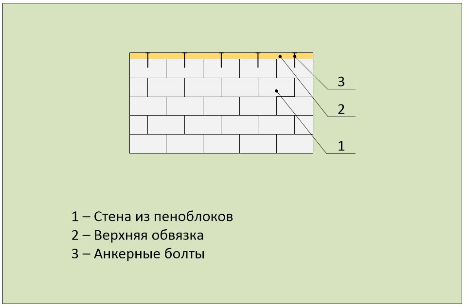 Правим горната облицовкаПолагаме горната плоча по периметъра на зидарията, като я закрепваме с анкери. Разстоянието между плочите е 60 см. Горната плоча е необходима, за да разпредели тежестта на покрива по цялата стена; поставянето на гредите директно върху блоковете създава отклонения, което води до разпадане на пенобетона.