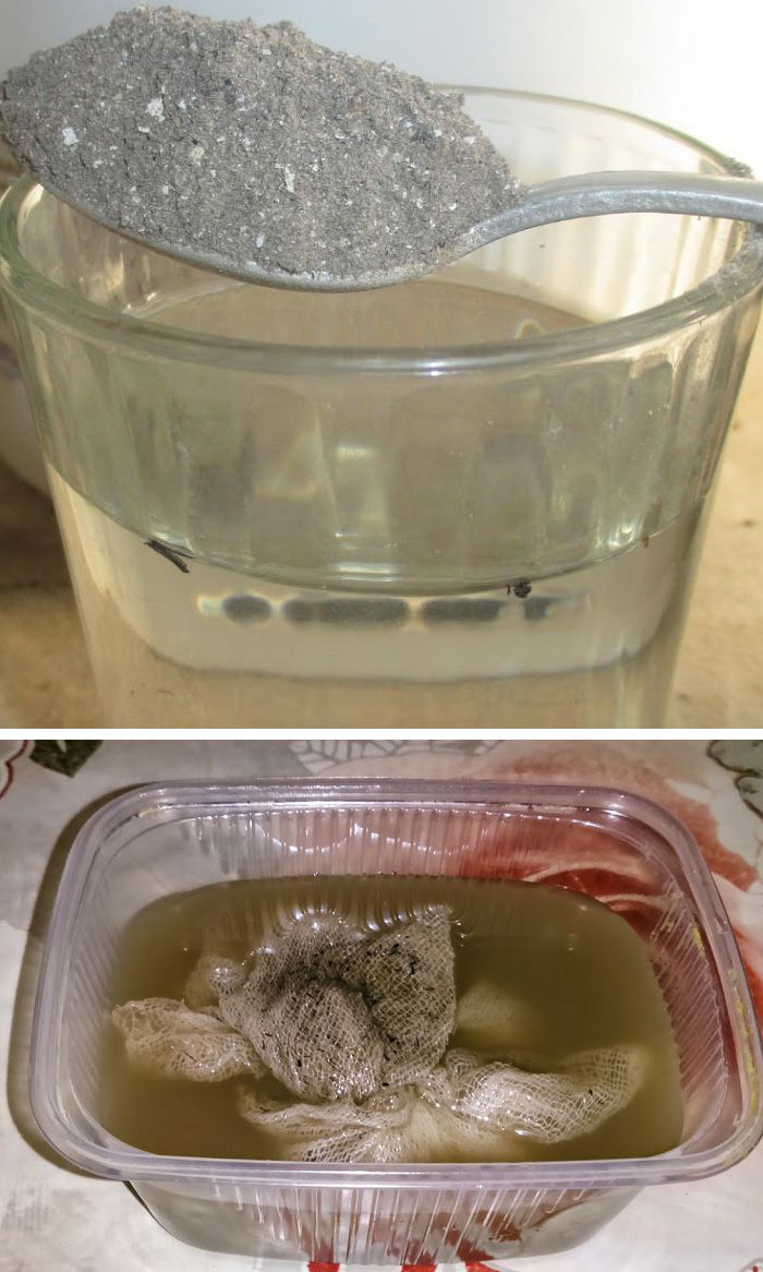 Пепелта се изсипва в топла вода и се оставя да се кисне в емайлиран съд в продължение на два дни. Разтворът трябва да се разбърква поне 2-3 пъти на ден. Получената смес се филтрира и се излива в пулверизатор.